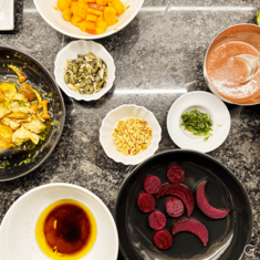 Oven-baked beetroot garnished with fried tarragon and roasted pine nuts; drizzled with coffee-infused light olive oil. Served with beetroot leaves dipped in a vinaigrette.