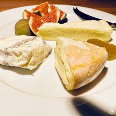 A selection of three kinds of Swiss cheese accompanied by fresh figs and fig-mustard.