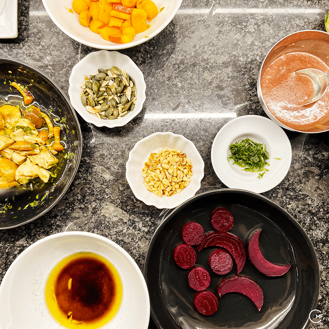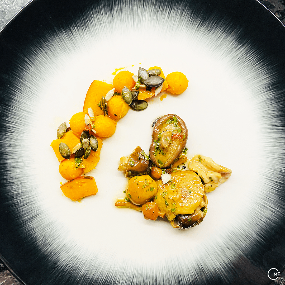 There is a healthy competition between us, which drives us to experiment and to reach beyond our limits. Denise has an edge on creating subtle, yet complex sauces and I exceed in plating. It’s a mutual respect that lets us create menus together. Denise and I both like to cook with seasonal and preferably locally sourced produce; hence we made the most of what the autumn season in Switzerland has to offer. Since I posted photos of the menu on my social media, a few friends ask me about the ingredients and description of each of the plates – so let me elaborate.