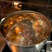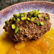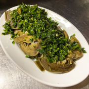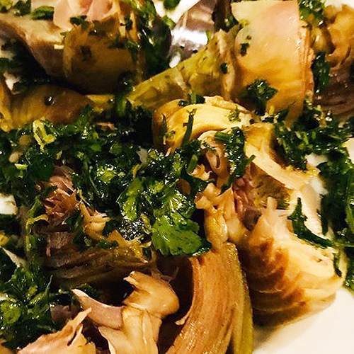 The menu started with creamy parsley root soup. Then followed by artichokes a la Romana with a hint of lemon and mint; Onion Frittata with sweet onions; green lettuce with a fig-mustard vinaigrette; Pasta e Fagioli classic Italian comfort food; a beef Brasato and Polenta slices covered with grated hazelnut and Parmigiano-Reggiano. Finally, the menu ended with a Chocolate Mousse and Kumquat coulis.