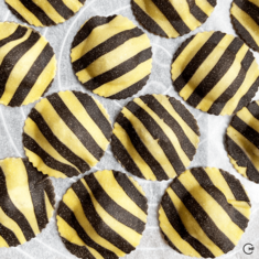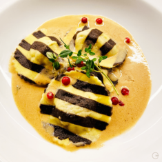 Wild boar filled ravioli with chocolate-powder stripes. Served in a creamy game sauce with lingonberries and lemon thyme.