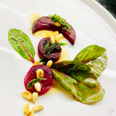 Oven-baked beetroot garnished with fried tarragon and roasted pine nuts; drizzled with coffee-infused light olive oil. Served with beetroot leaves dipped in a vinaigrette.