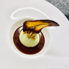 The dessert is a pear and almond pâte, topped with roasted almonds and an oven-dried and caramelised slice of pear. Surrounded by a boozy warm chocolate-pear-brandy sauce.