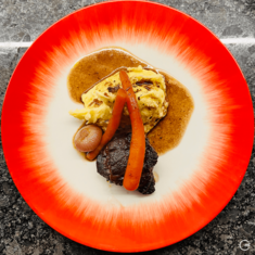 Braised veal cheeks with vegetables and potato purée served with a rich reduction from the sauce.