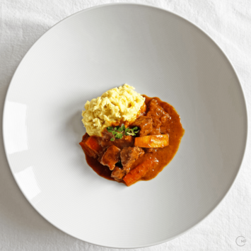 Braised for hours in oriental spices and with carrots and oranges, the meat becomes buttery soft and the sauce spicy. Served together with mashed potatoes, an irresistible classic with a twist.