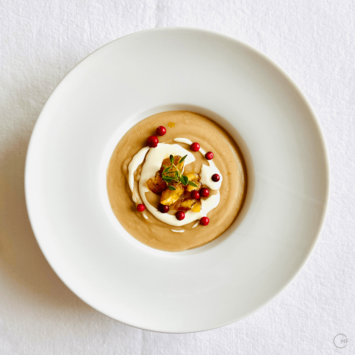 Hot chestnuts, chestnuts very hot! Who hasn’t heard the calls of the street vendors praising their roasted chestnuts for sale? The soup is creamy, warming and finely seasoned. The sour lingonberries are little explosions of taste.