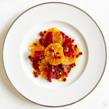 The delicate, earthy-sweet taste of the beetroot and the citrus freshness of the sun-ripened oranges together with the crunchy pomegranate seeds complement each other wonderfully and are a contrast to the first course.