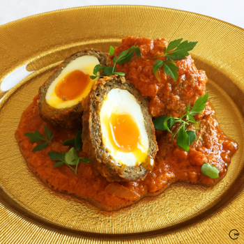 A Scotch egg consists of a hard or soft-boiled egg wrapped in sausage meat, coated in bread crumbs and baked or deep-fried. The practice of encasing a pre-cooked egg in forcemeat is also known in North Africa and in the region of Iran and Northern India where the Mughal emperors reigned – there it is known as Nargisi Kofta – Narcissus meatballs.