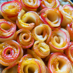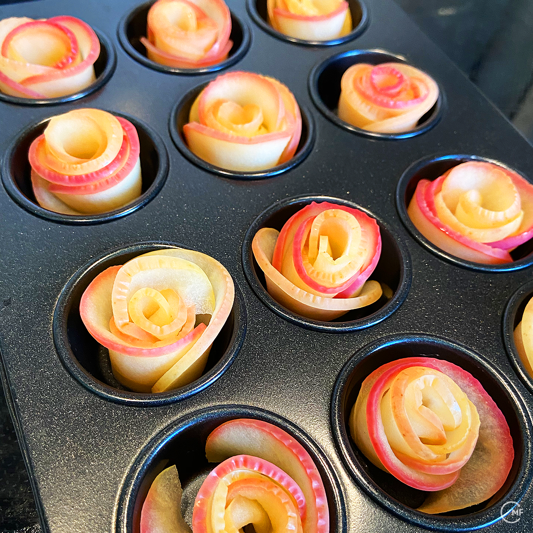 Take three slices of apple starting with a smaller slice and overlap with the next two slices covering about a third. Then gently roll up the slices beginning with the smallest and shape into a rose. To prevent them from falling apart again, I put them into a small muffin tray to keep them in shape. Continue until you have all rolled up.