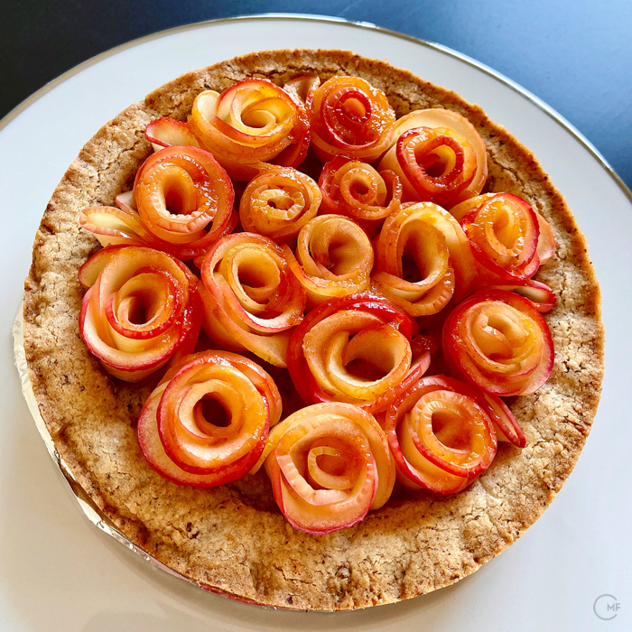 I love short pastry, and for this cake, I made a variation of the pastry I use to make Linzer cake. Instead of the warm flavours of cinnamon, I used more lemon peel to give it a fresher taste suitable with the apples. And since it was going to be a birthday cake, I decorated the cake with roses made of thin apple slices.