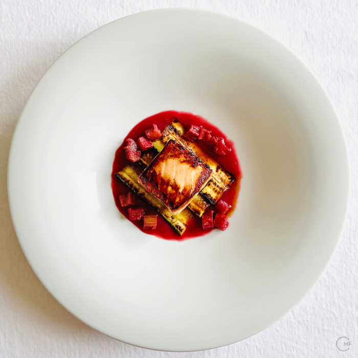 Serve | Place the zucchini slices on the plate, spoon the sauce with the rhubarb cubes around and place the salmon cube on top.