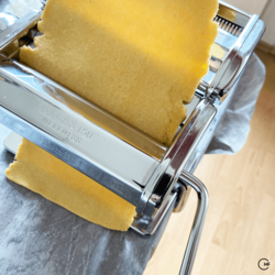 - If you use a pasta machine, press the parts a little flat and roll them out into thin strips. You start with rollers set at level 0. Fold the dough again and again, dust with some flour and turn through the machine. After repeating this 4-5 times, set the next lower level. You should stop at level 6 or 7. Otherwise, the dough sheets will become too thin.