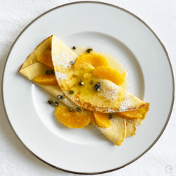Serve | Lay the warm pancakes on warmed plates. Spoon a few or orange slices onto the pancakes fold it it to a third. Spoon some more orange slices on top, drizzle with the orange sauce. Sprinkle with some cut pistachios and dust with icing sugar.
