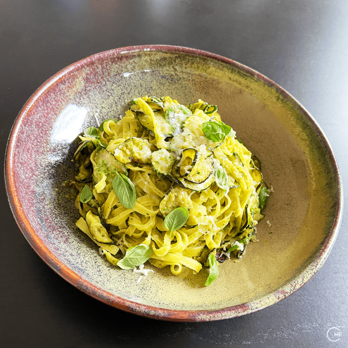 Mix the grated provolone with the pureed zucchini. Add a little hot pasta water until the sauce has a creamy consistency. Season to taste with salt and pepper. Now mix the fettuccine and zucchini slices well with the sauce. Garnish with basil and serve warm.