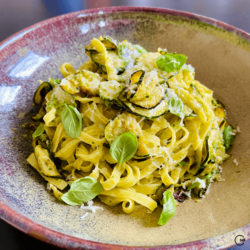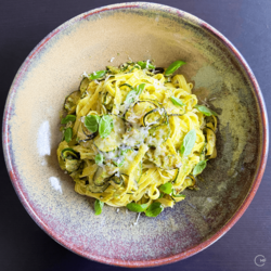 Strain the fettuccine. Catch a cup of pasta water. Add the fettuccine to the pan with the zucchini slices and fry for a minute. Reduce heat.