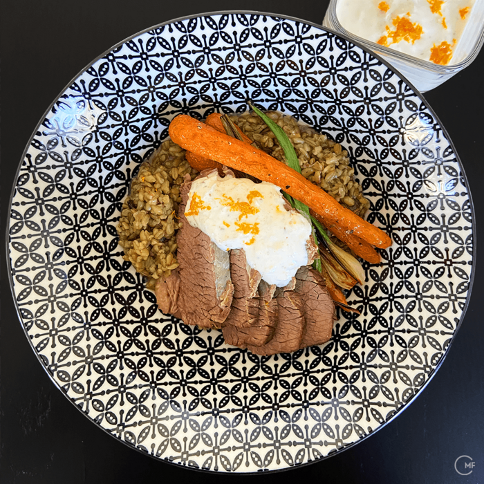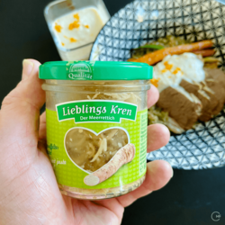Levantine-inspired boiled beef with a twist – instead of the usual ingredients, this version is prepared with oriental spices. LieblingsKren is small-cut Horseradish in a glass and I refined the yoghurt sauce with it and added the grated zest of an orange.