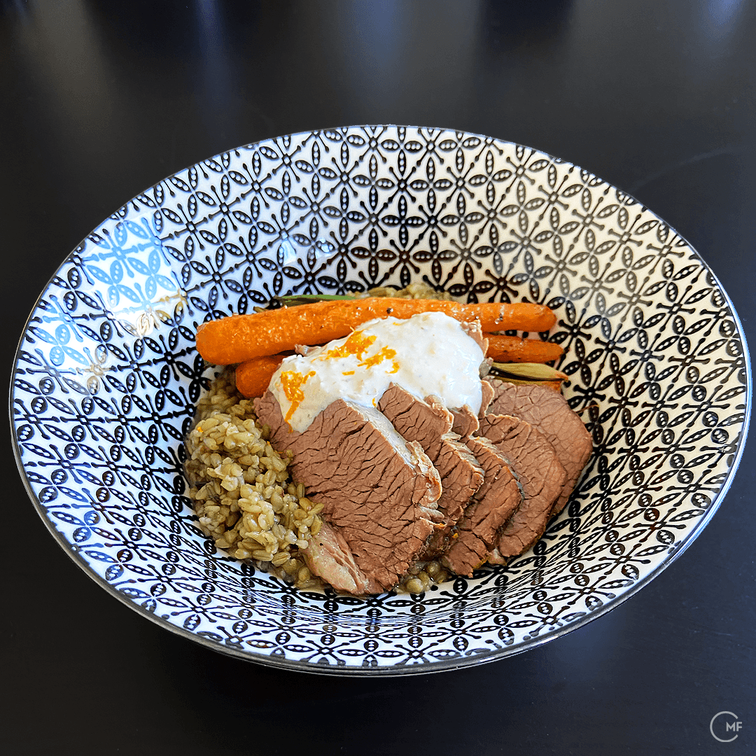 Serve | Carve the meat into slices. Ladle the Freekeh into the plates and lay the meat and vegetables on the top. Finally, garnish with a little yoghurt-horseradish sauce. Saha w hana! صحة وهنا!