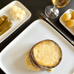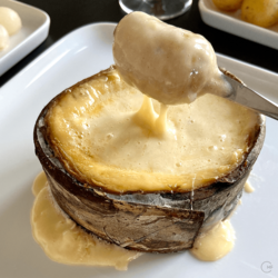 Poke with a fork to test the consistency. Once the cheese is melted and creamy serve it on the hot plate immediately. - Poke the potatoes or bread cubes on to forks and dip them into the creamy cheese – enjoy!
