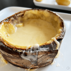 - Place the whole cheese on a heat prove plate and melt the cheese in the oven. It takes about 15–20 minutes to get it soft.