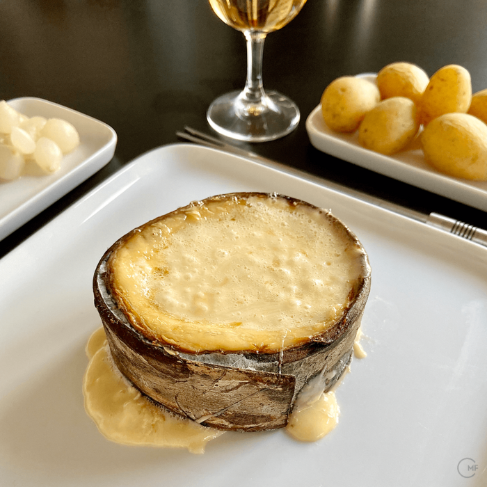 The spruce adds a distinct spicy pine aroma to the strong flavour of the cheese. Made from cow milk, the consistency is soft and creamy, ideal for melting. The size of the cheese is just perfect for a one portion Fondue.