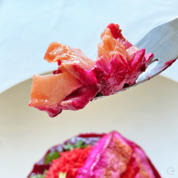 First, cut the salmon fillet into 4 equal slices. Dab the fillets dry with kitchen paper and lay them in a flat glass dish. Pour 300 ml of beetroot juice over them, make sure the fillets are covered. Cover the dish with kitchen foil and let the salmon cure in the fridge for at least 36 hours. Turn the fillets from time to time to make sure they are cured evenly.