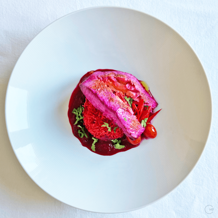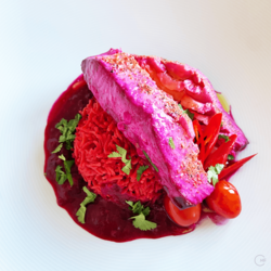 The colours of love are vibrant reds and pinks. For this dish, I cured the fresh salmon filet in beetroot juice for about 36 hours in the fridge and cooked the Basmati rice in beetroot juice as well. The result is eye-popping – ideal for a romantic dinner.