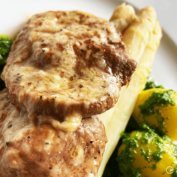 Put the dish in the top part of the oven and let the cheese melt. This will only take 2–3 minutes.Serving | Spoon the pesto sauce onto the plates, place the asparagus and potatoes on the sauce and add the veal escalopes. Drizzle some more pesto sauce over the potatoes and serve.