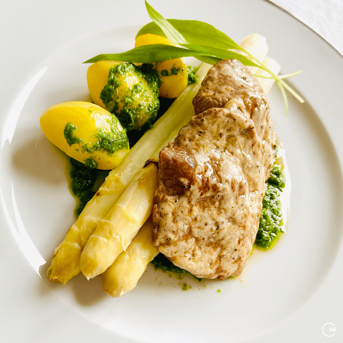 This dish screams springtime. Veal escalopes baked over with truffle-infused cheddar cheese served with white asparagus, fresh plucked young wild garlic from the nearby forest made to a pesto sauce and small potatoes. A combination of delicate and powerful flavours that go well together.