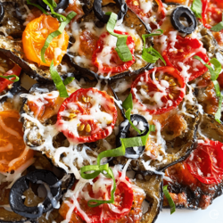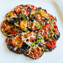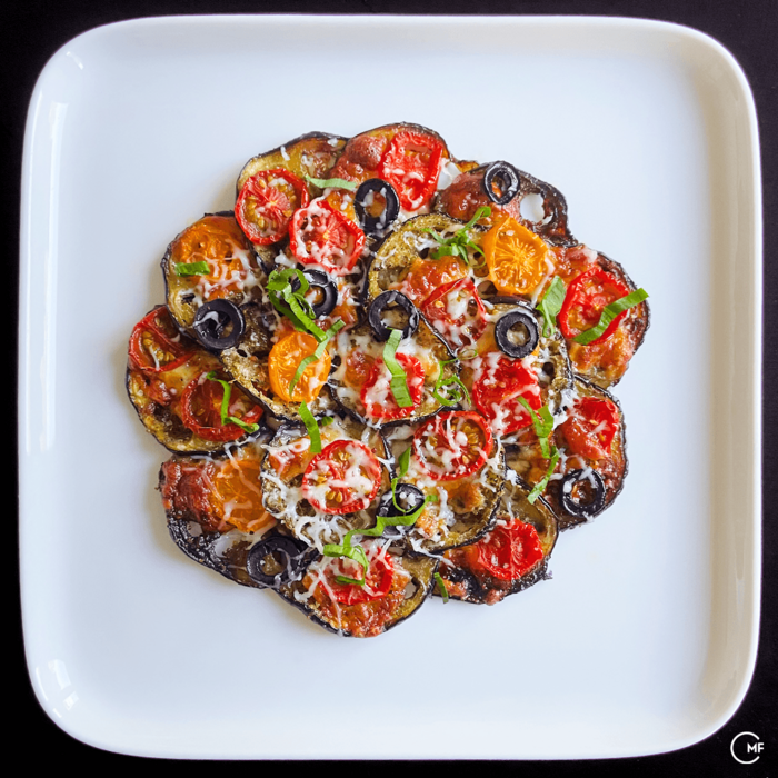 It's layered vegetables and cheese baked in the oven without a dough base, and because it is without the dough, it is, of course, gluten-free. The thinly sliced eggplant and cheese get slightly crunchy when baked.