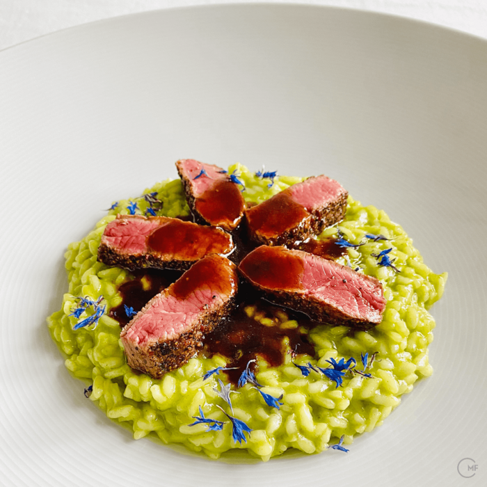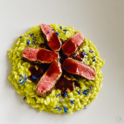 SERVING | Spoon the risotto onto deep plates and top with slices of the lamb. Drizzle with the sauce and for the final touch sprinkle with some dried blue cornflower petals.