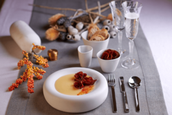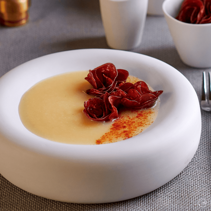 Heat in an oven preheated to 150° C for 15–20 minutes – this is how the roses keep their shape and become slightly crispy. - Ladle the soup on the plates. Dust with some smoked paprika and decorate with three dried meat roses.