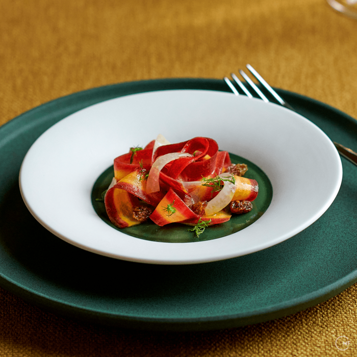 The salad is colourful and crisp. The sweet aromas of carrots, fennel, raisins and the pinch of cinnamon in the vinaigrette set us in the Christmas spirit.