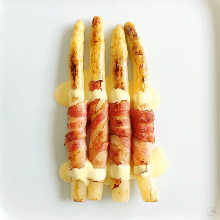 White asparagus is soft and has a delicate flavor. In contrasted, the bacon is crunchy and savory in taste. The classic Hollandaise sauce goes well with both. A beautiful starter or with more on the plate an excellent main course.