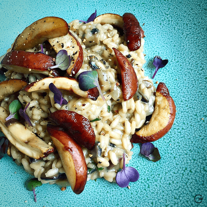 Serving | Spoon the risotto into bowls and top with the fried mushroom heads. Decorate with some fresh small leaves and some fresh ground pepper. Serve immediately.