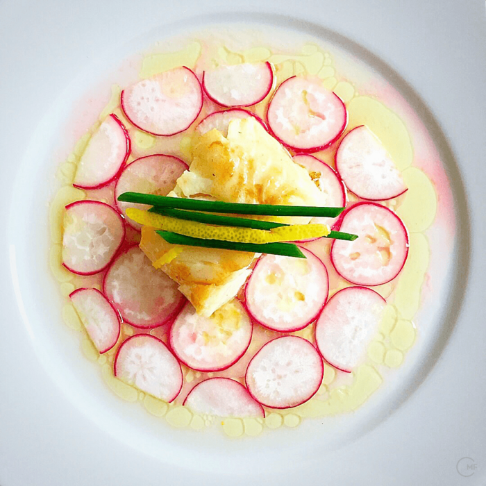 A light, fresh, and simple dish. I thought of it as a starter or a first course. The combination of the gently fried cod with the sliced radishes and the lukewarm lemon vinaigrette is delicious. Of course, the presentation adds to the beauty.