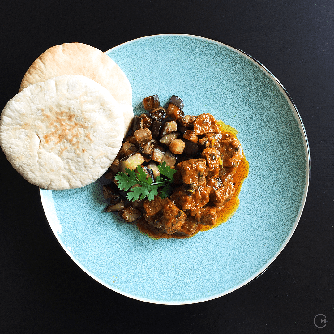 Inspired by Pakistani Mutton Karahi, this dish is a free interpretation. Instead of mutton, I used lamb and served the curry with diced and fried aubergines, they accompany the spicey meat well.