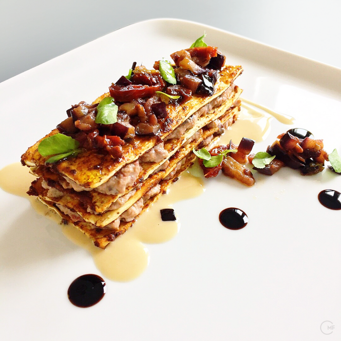 Inspired by millefeuille desserts I created a starter with sliced and layered Aubergine | Eggplants and dried tomatoes. It's accompanied by Tahini sauce and droplets of concentrated Balsamic Vinegar.