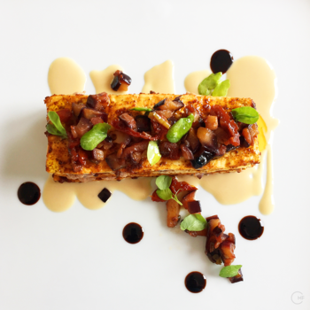 Serve | Spoon some Tahini sauce on the plates and place the layered Aubergine on top. If the Tahini sauce is too thick add a few drops of water until it has the right consistency. Spoon the set-aside fried Aubergine, tomatoes, and onion mix over the top layer. Finally, add some drops of the reduced Balsamic vinegar on the plates and add some small green leaves.