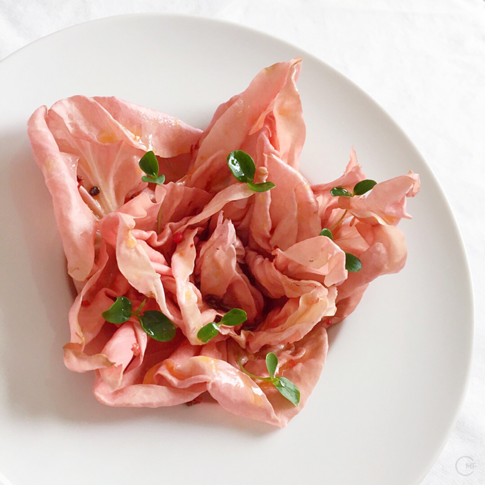 It was love at first sight when I saw the vibrant color of this lettuce at my local greengrocer. The beautiful pink radicchio needs nothing more than a slightly sweet vinaigrette to balance its pleasant bitterness. I served it with a fruity mandarin-yuzu and cold-pressed rapeseed oil dressing, finished with a sprinkle of pink peppercorns.