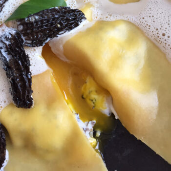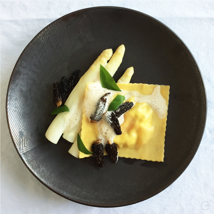 A raviolo with a runny egg yolk, white asparagus and morels. The ingredients of this dish are the epitome of spring: the egg as a symbol of fertility. The beginning of the season of white asparagus in Switzerland. The awakening forest smells of wild garlic. And fresh morels are an ideal match.