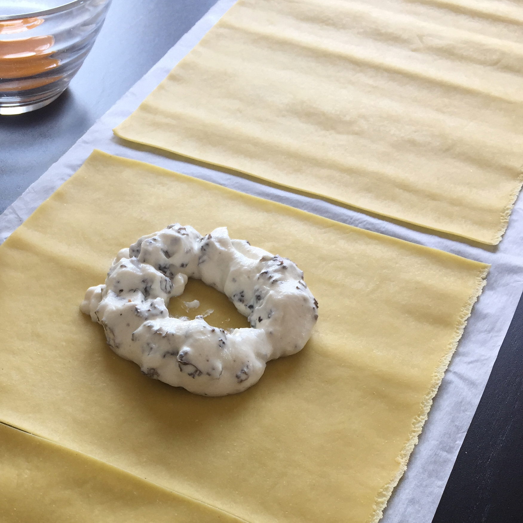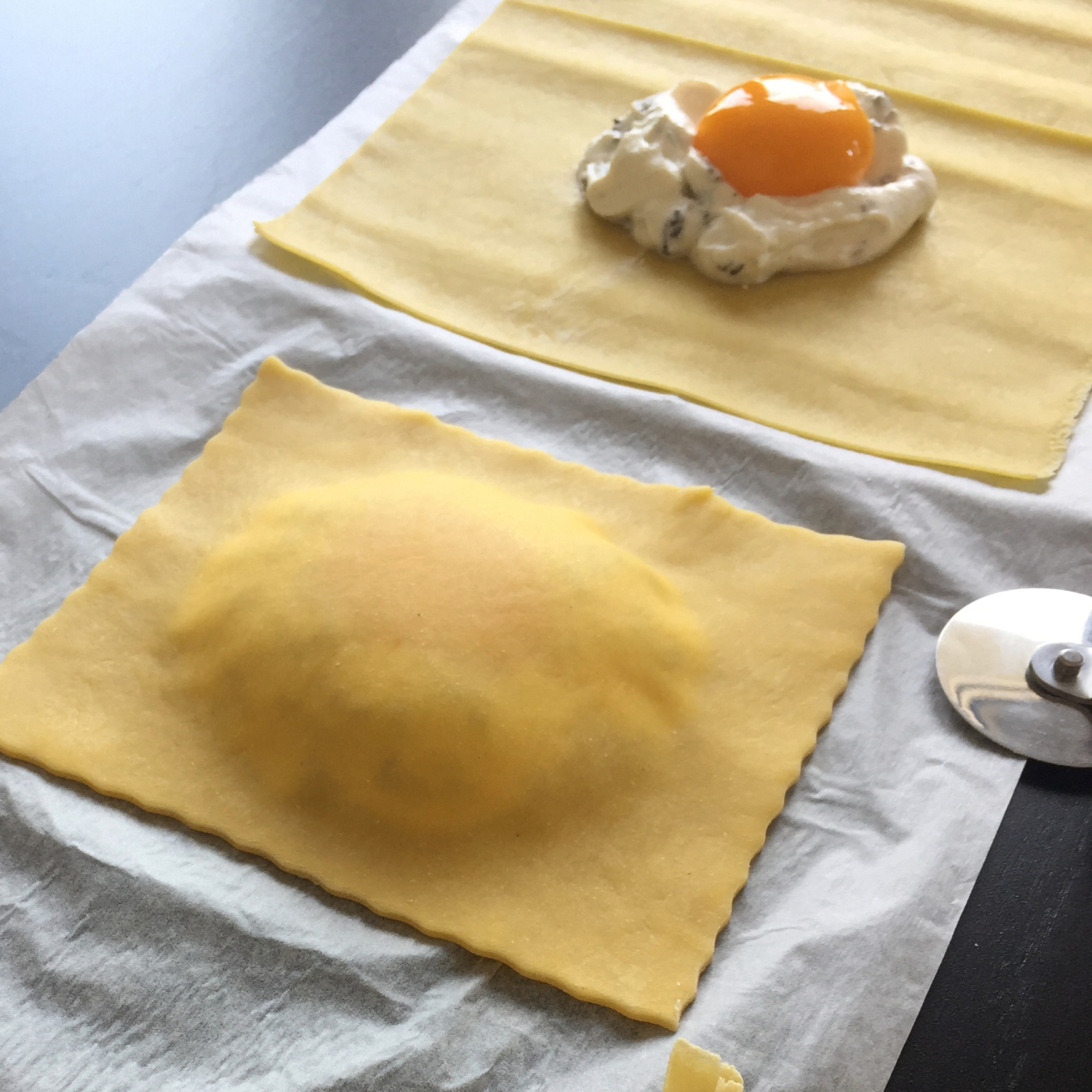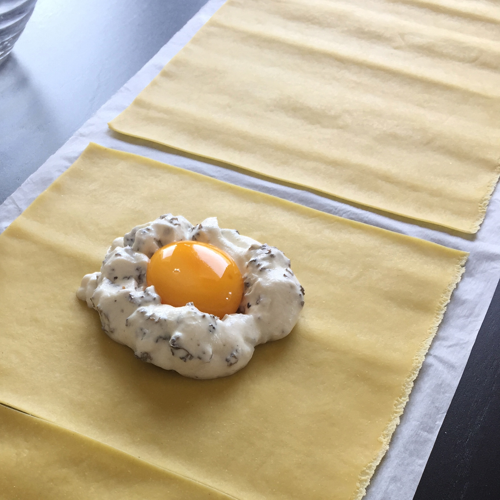 Roll out the fresh pasta and cut eight equal parts. Apply a ring with the filling on the pasta parts. The ring should leave room for the yolk. Carefully separate the egg yolks from the egg whites and let them slide into the middle of the filling.