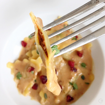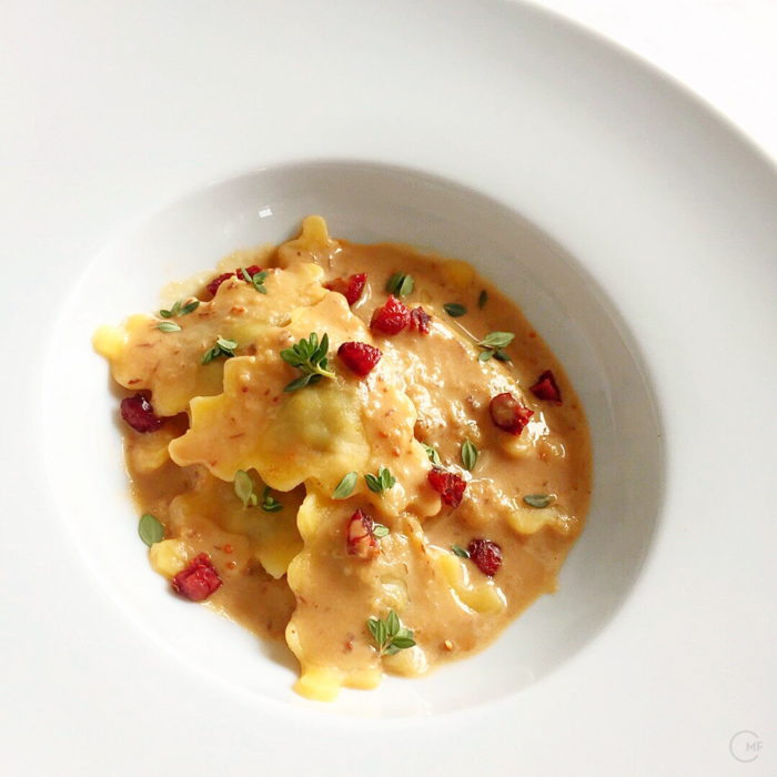 I wanted to make Ravioli with a beef ragout filling for a long time, and this was the chance to do it. The accompanying sauce is creamy and balanced by the bittersweet flavor of the cranberries.