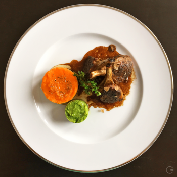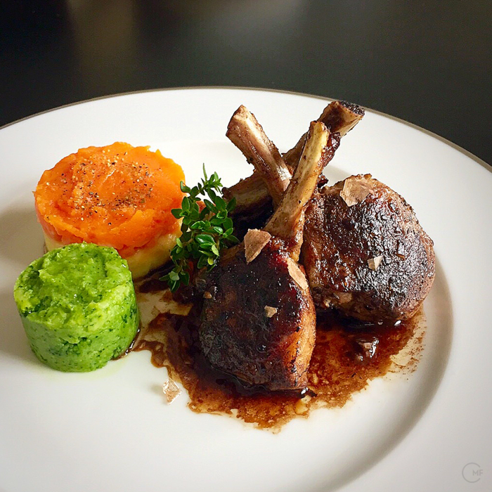 Fried lamb cutlets, nice and crusty on the outside, pink on the inside sprinkled with coarse smoked salt. Served with three different vegetable purees – broccoli, carrots, and parsnips.