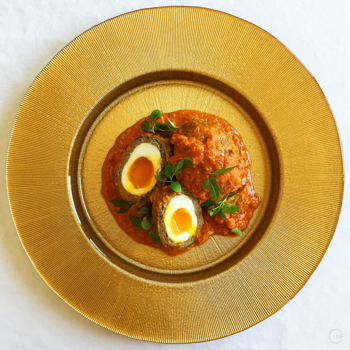While searching about the history of the Scotch Egg, I discovered this recipe for eggs encased in mouton forcemeat and served with a spicy tomato sauce. The Nargisi Kofta – Narcissus meatballs – have their origins in the Mughal kitchen in Persia and Northern India. Most possibly, the British brought the idea to Europe during the British Raj, and the Scotch Egg is derived from it.