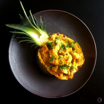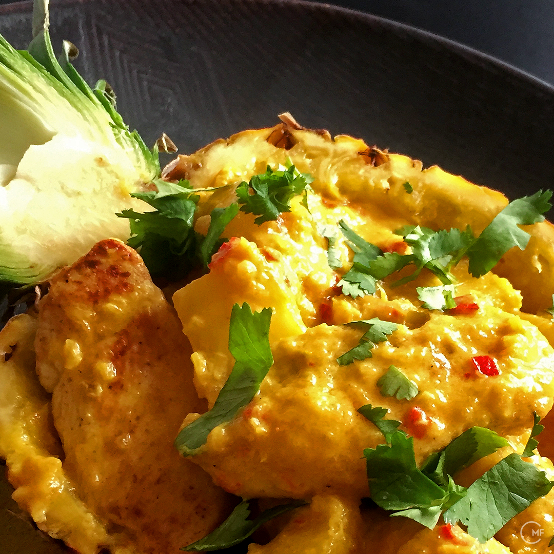 Chicken fried in South Asian spices, and balanced with the fruity sweet and sour flavor of the pinapple are a wonderful treat, especially when served in half of a pineapple.