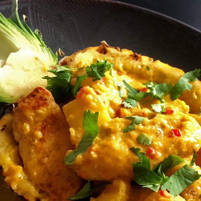 Add the chicken and the nicer pineapple pieces set aside. Add a tablespoon of freshly chopped coriander and mix well. Cook on a low heat for another 5 minutes. Season with salt to taste.