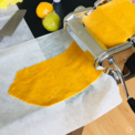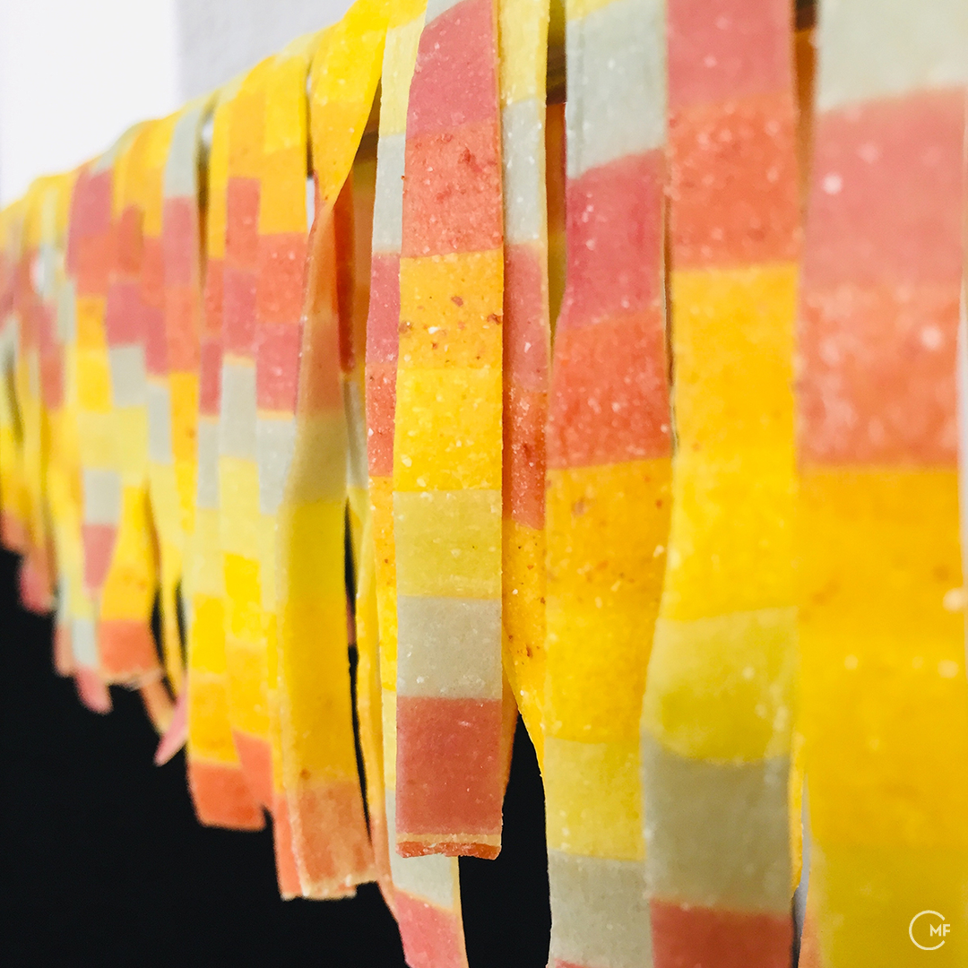 - When all doughs have been made (base and 6 colors) they are mangled through the pasta machine. First with level 0 and then continue to level 6. Place all dough sheets on baking parchment. The colored dough sheets are then additionally cut by the machine into linguine strips.