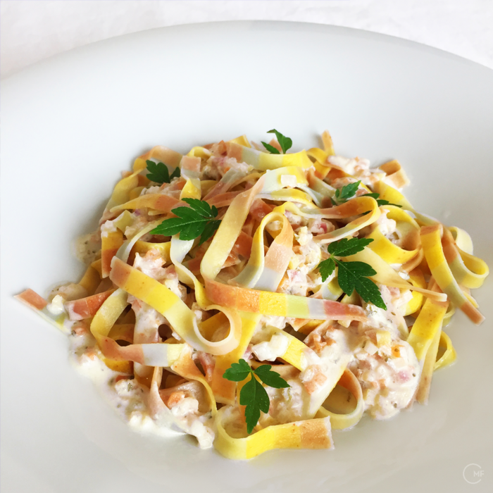 The making of differently dyed doughs takes time, a big table and the joy of the work. Doing it together with someone, is of course more fun. It has to be said, you can also make the pasta with a rolling pin and cut it to strips by hand, but with a manual pasta machine it's much easier.