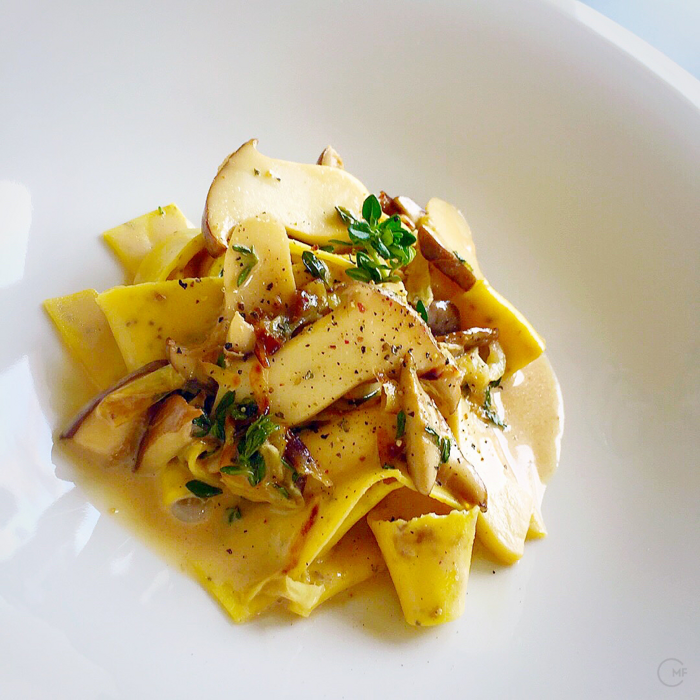 I enjoy making my pasta, as I can add flavors that I like to the dough. For this dish, I created Pappardelle with ground morels, to give them a distinct mushroom flavor. Served with fried king oyster mushrooms and a creamy sauce with lots of fresh thyme make this dish a special treat.