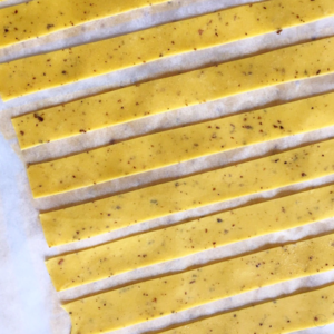 Homemade pasta - For the dough take 260 g of semolina flour and three eggs. Put the flour together with the dry ground morels and turmeric in a bowl and make a dent in the middle, add the eggs and mix the flour from the outside in with the eggs. Remove the coarse dough onto a floured work surface and knead vigorously with your hands until it is smooth and no longer sticks to your hands. If necessary, add some flour if it is too sticky, or a drop of water if too dry. Wrap the finished dough in a plastic wrap and let it rest for at least 30 minutes.